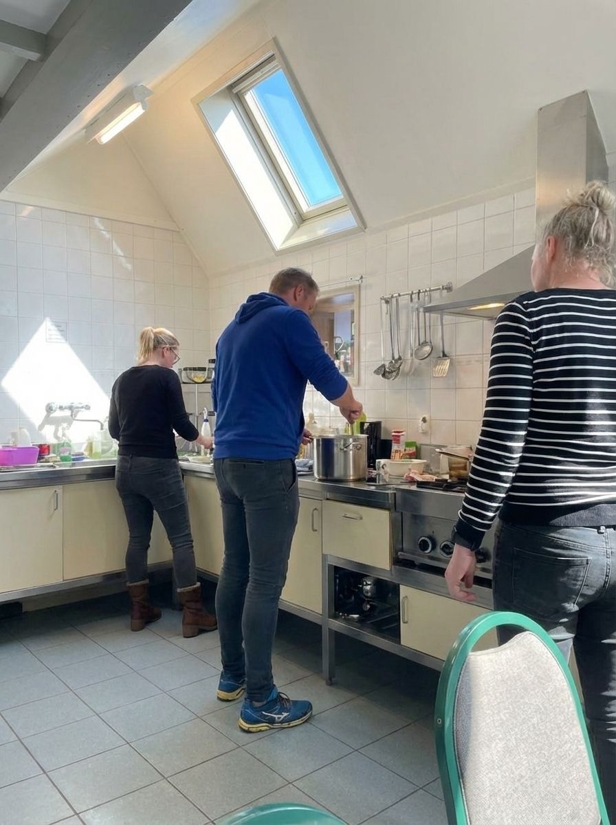 Na een ochtend buiten kan de groep heerlijk bijkomen, koken en overleggen in hun eigen